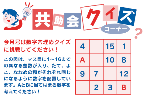 正解者のうち抽選で10名様に記念品を贈呈いたします! 下記の問題を解いて、応募フォームから応募ください。また、応募は会員本人につき1回限りとなります。(ご家族の方は応募できません。) 当選結果は、記念品の発送をもって発表にかえさせていただきます。 応募の締切日:令和8年1月31日(土) <問題> <応募方法> 応募フォームからご応募ください。以下のボタンをクリックすることでフォームが表示されます。